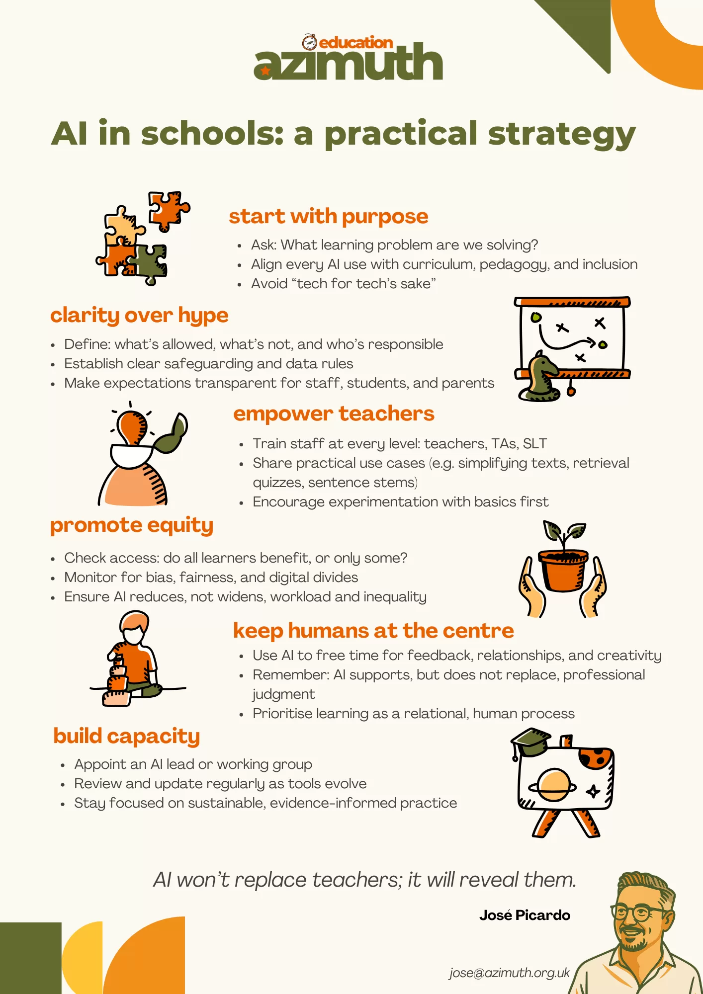 If you’re a leader, governor, or teacher who wants to take the next step in crafting an AI strategy that is evidence-informed, humane, and sustainable, I’d love to work with you, putting learning first and using technology to serve that mission. Don’t hesitate to get in touch or leave a comment.